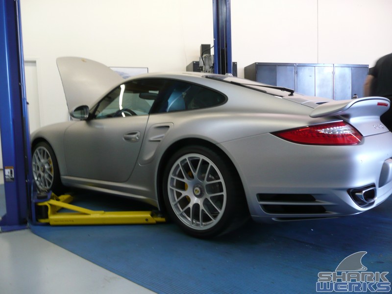 Off with the stock wheels (which are actually 3-6pounds heavier than the HRE's going on) and on with the factory 997GT2 side skirts: