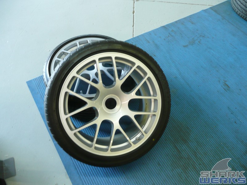 The HRE P40C's with tires/TPMS installed. You can see the extra machining done on the spokes to save weight: