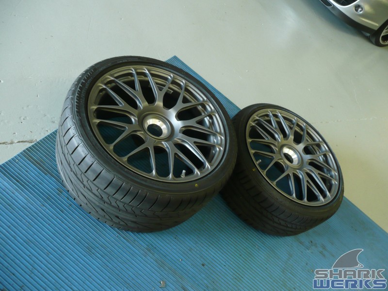 There we go, the new wheels fill the fender much better now. The original factory centerlocks are tucked in due to a very conservative offset hence we went for a more aggressive fitment.