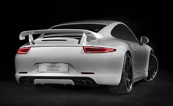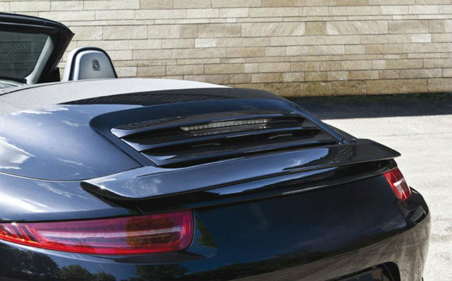 At speeds of 85+mph the TechArt front Spoiler 1 reduces the uplift and the front axle of the 991 S by 5 kilograms. The Type II rear wing generates and additional 17.5 kilograms of additional downforce. The aerodynamic advantage grows with speed and at the top speed of 189mph there is an additional 76 kilograms of downforce overall. It will also fit cabriolet models.