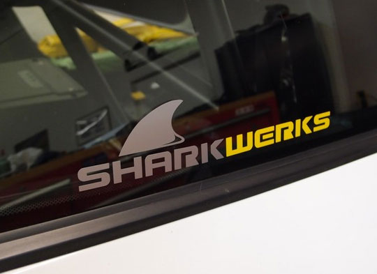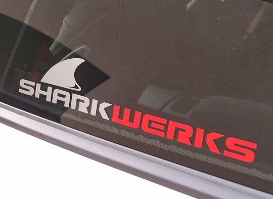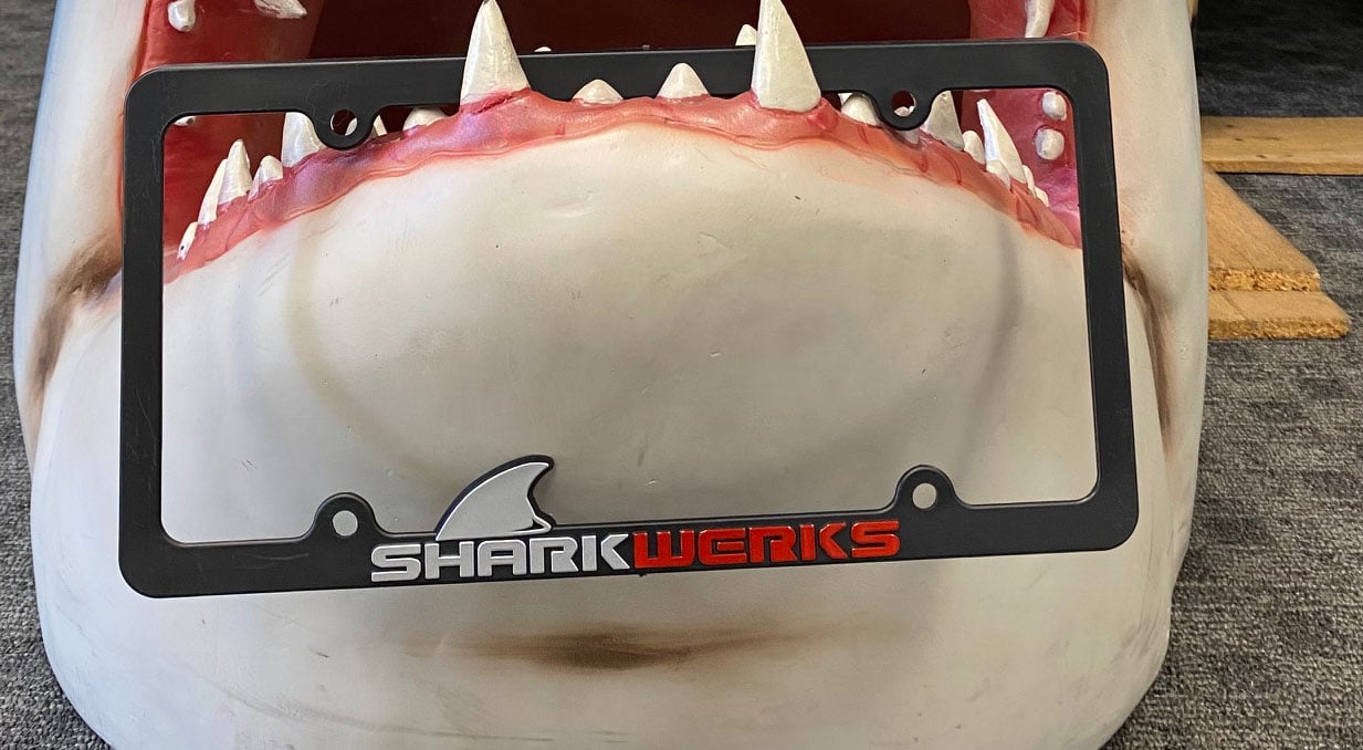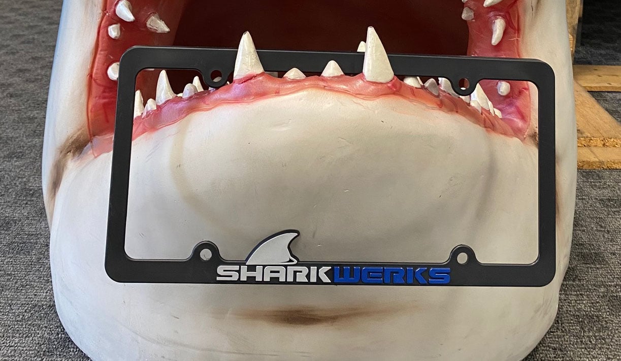 Represent Shark Werks with a Shark Werks License Plate Frame and Window Decals