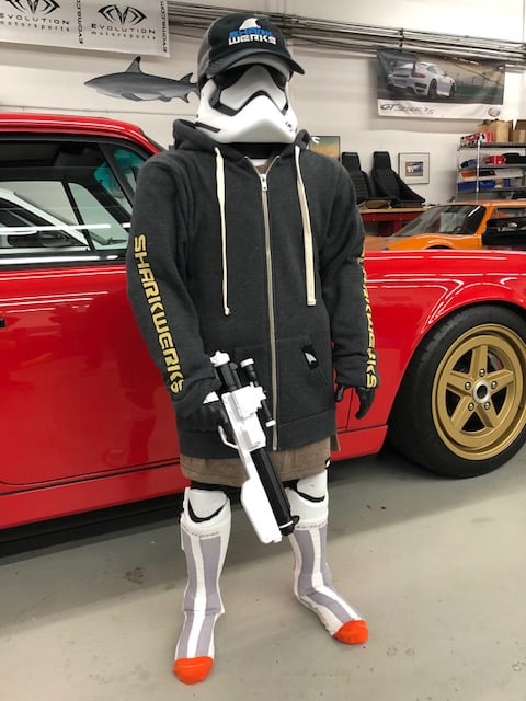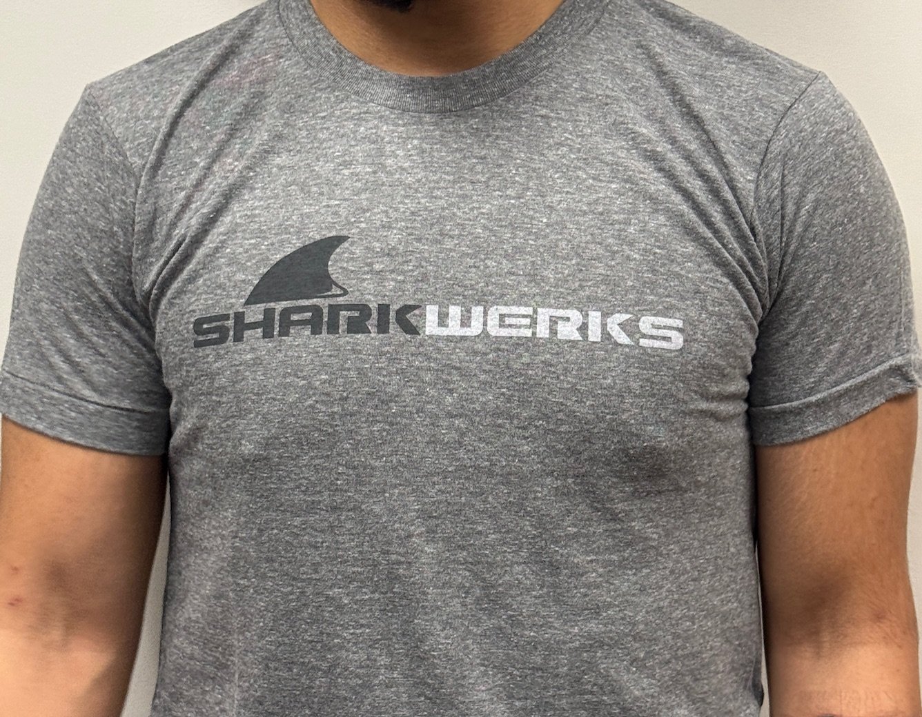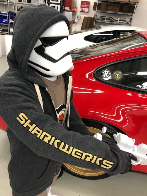 These hoodies are charcoal with a red & gold graphic on the back, along with gold "SHARK WERKS" sleeves and a few little details enthusiasts will appreciate.