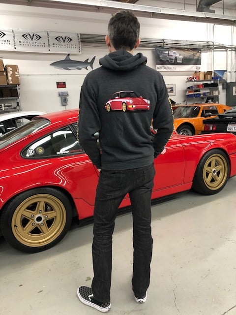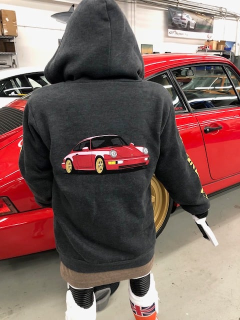 We teamed up with our chums over at Heel & Toe Apparel and artist Lane Skelton from Driving While Awesome to bring our air-cooled Guards Red Shark Werks project 964 to life in the form of this sporty, light-weight & comfy hoodie!