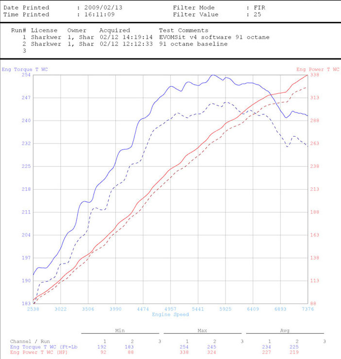 Power is measured at 4 wheels on an independent Mustang 500 SE AWD dyno in a controlled environment for accuracy. Dyno runs shown are the average runs of a 10 run sample group for both the Baseline and EVOMSit modified runs. Dyno runs are accurately run with the same RPM start point, same transmission gear, same octane fuel and same cool down time in-between runs. Measurement was made with 1 x 65,000 CFM main cooling fan in the front of the vehicle with 2 x 5000 CFM "spot" cooling fans to extract exhaust fumes from the exhaust. Dyno room temperature was 64.2 degrees Fahrenheit for both sets of run groups and fuel grade was 100% pump 91 octane CA grade oxygenated fuel.