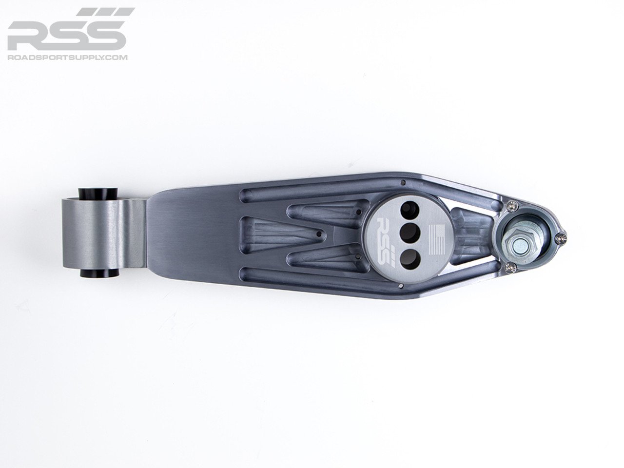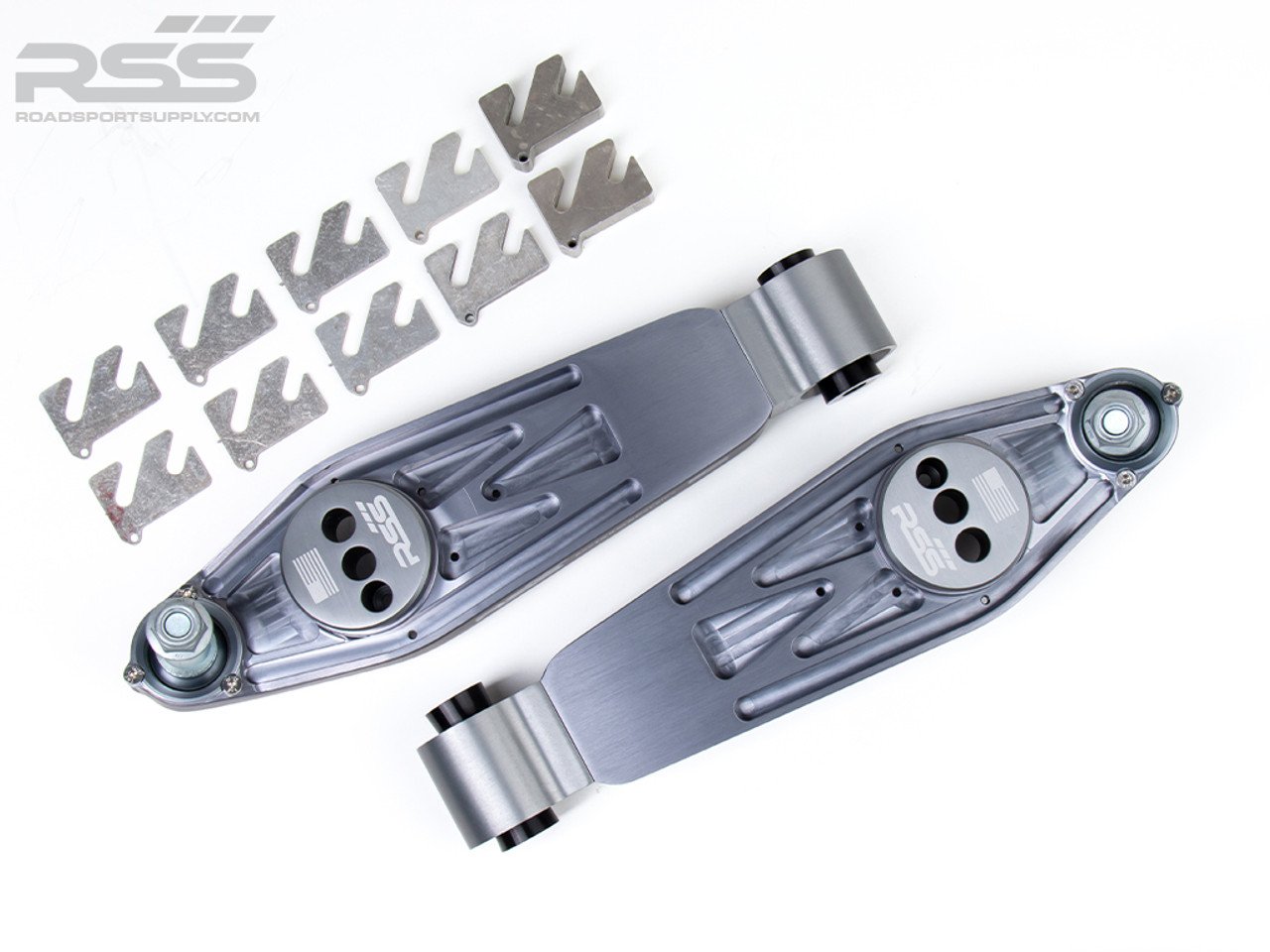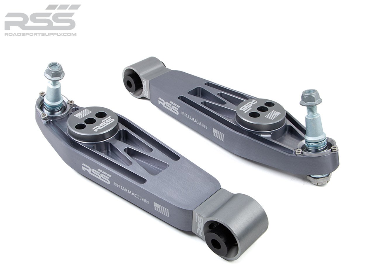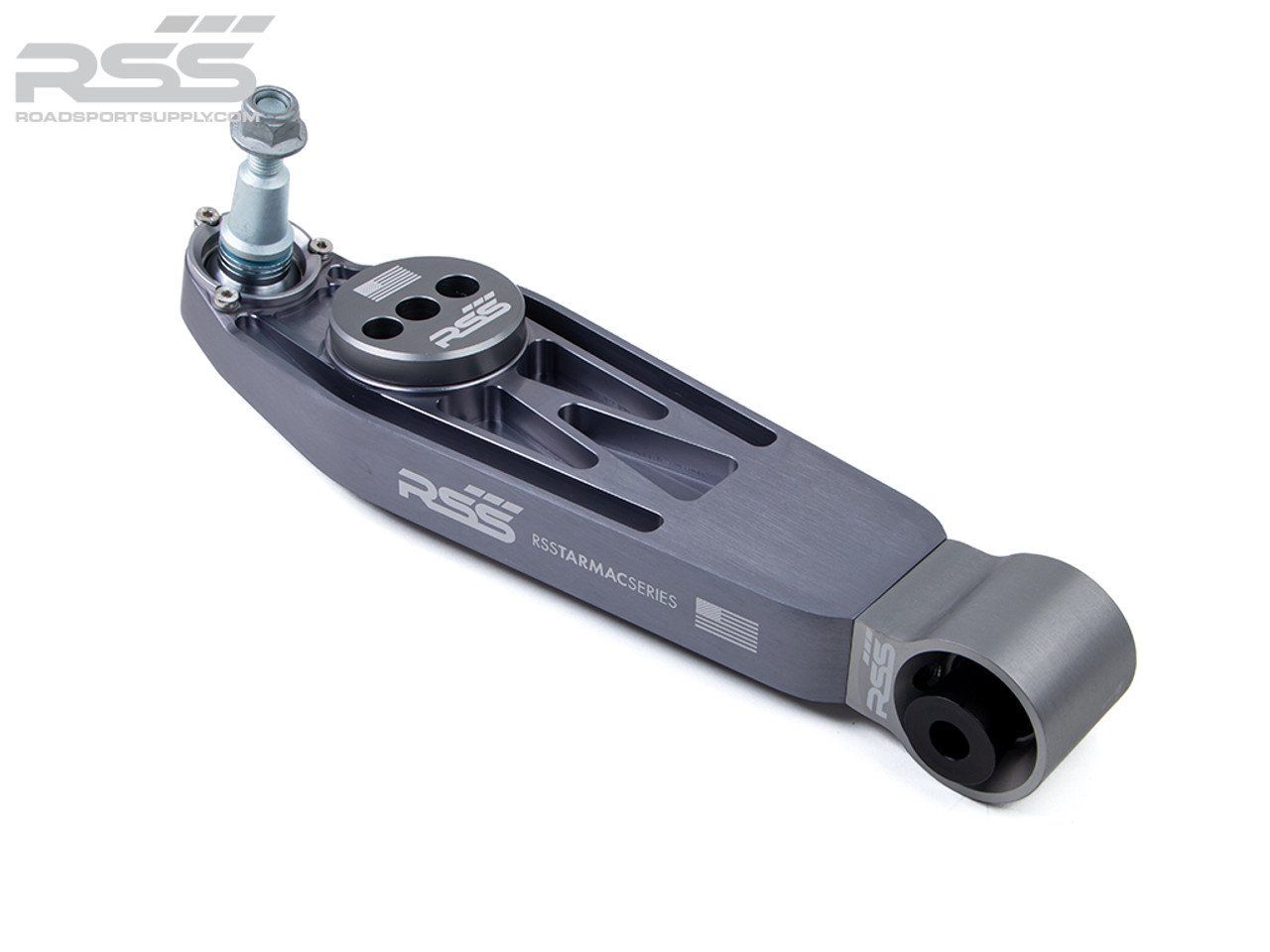 RSS High Performance Tarmac Series Suspension Components are designed, engineered and manufactured on location here in the USA. RSS Tarmac Series Control Arms are manufactured from 6061 aerospace grade billet aluminum. This allows for a more uniform molecular structure at every point of the arm over the cast motorsports arm giving the customer a more durable and inherently stronger part. Manufacturing from billet aluminum rather than casting results in less impurities in the metal. Completely serviceable – for the extreme, repetitive track-day participant, our high-strength steel alloy spherical bearings (with a friction reducing / longevity increasing Teflon liner) can be replaced unlike the motorsports arm, in which case the customer will have to buy a new set of arms if the spherical bearings are worn. Additionally, anodized surfaces and zinc-plated steel parts allow for better corrosion resistance against the elements. Adjustable suspension geometry – adjust dynamic camber values and roll center heights with our unique zinc-plated steel bushings. Solid monoball control arm ends offer a more responsive suspension over the factory one-piece rubber-injected control arm (also uses the same high strength steel alloy spherical bearing found in our control arm monoball kit). Unique design provides more gusseting over the motorsports arms for added strength and aesthetically appealing looks.