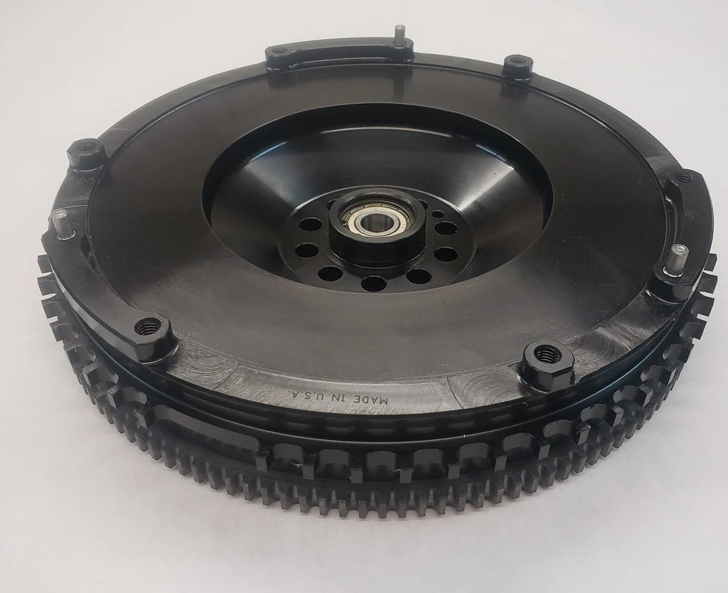 A single-mass flywheel is a one-piece, rigid disk of metal, either aluminum or steel. Our flywheel also comes with new flywheel bolts for installation. The weight difference is significant with the stock dual-mass weighing in at 28.5 pounds vs. our single -mass piece at 14.3 pounds.