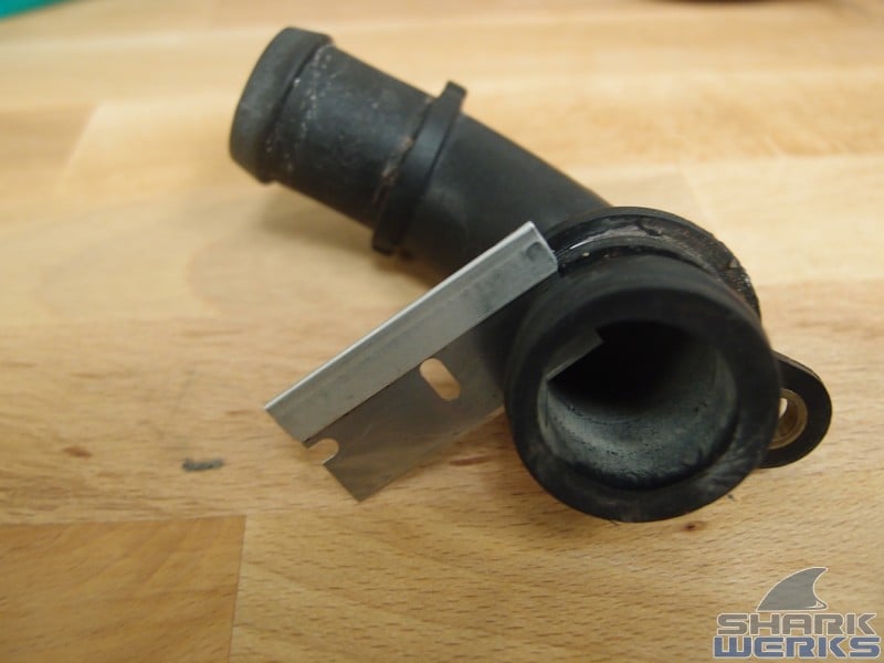 Shark Werks GT3 Coolant Pipe shown next to the stock plastic part: