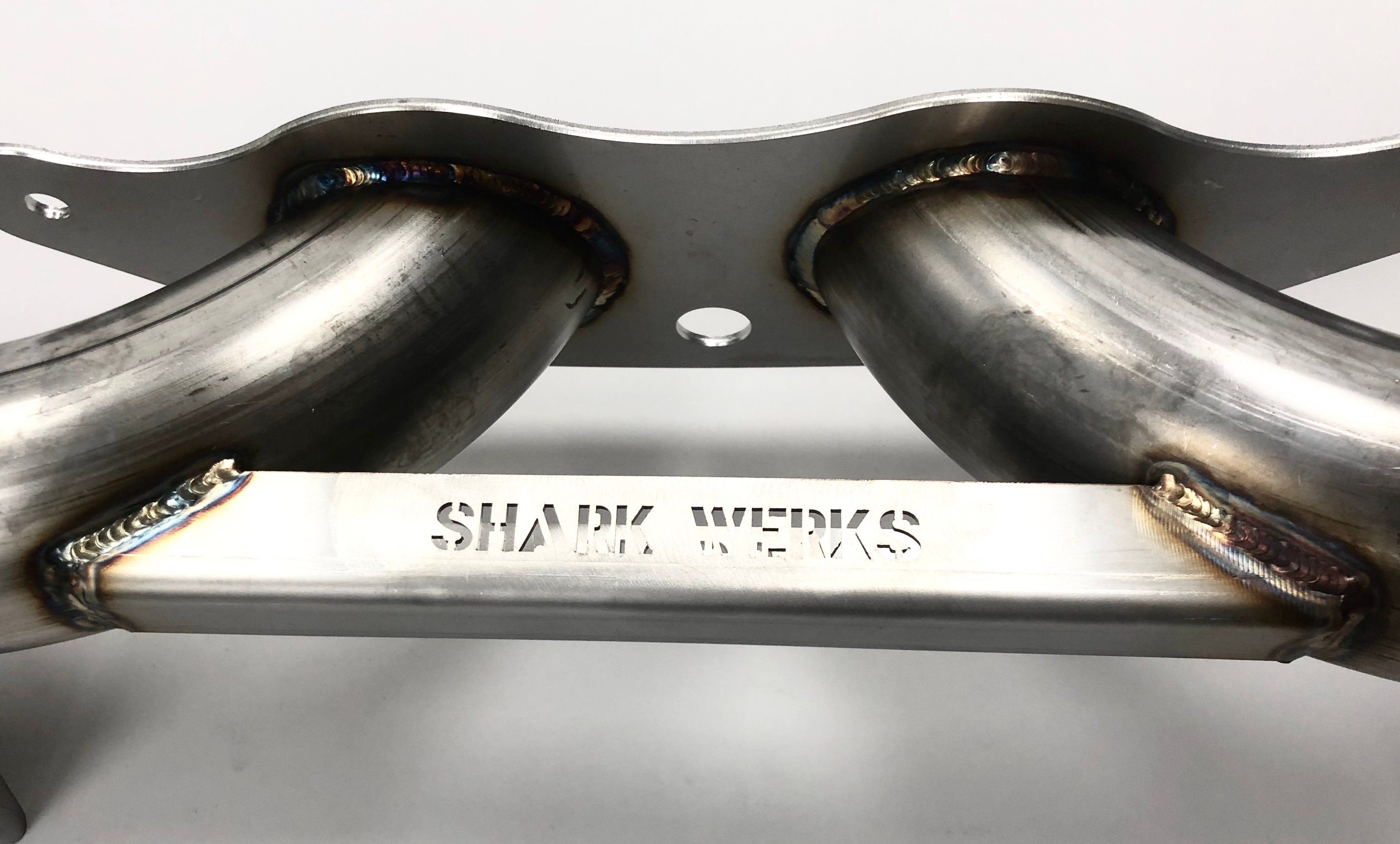 The Shark Werks GT3 / GT3 RS Muffler Bypass System which has been designed, developed and tested on the Shark Werks 2007 997 GT3RS (ZKERMIT), dramatically improves the sound of any 997 GT3 or GT3 RS, including the 2010+ MkII models and the GT3 RS 4.0. From day one, we felt the single biggest let-down with the car was that it was just too docile and quiet. This is in large part due to the strict sound-level restrictions in Europe and hence the factory deemed fit to equip these cars with a total of three mufflers! With our Muffler Bypass System we believe we have addressed that and not only uncorked the beast that is the GT3 motor but also reduced a real 16 pounds off of the rear end in the process. This has been achieved without sacrificing the drivability or diminishing the aesthetics.