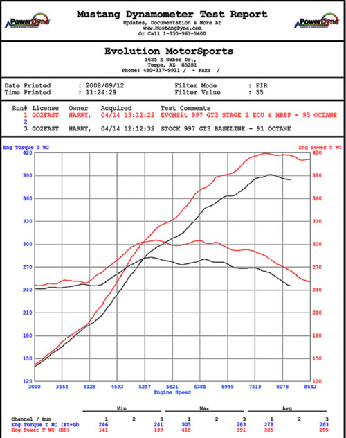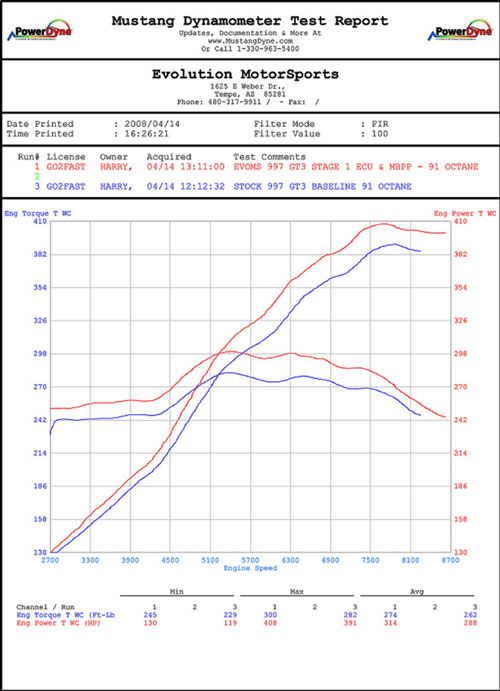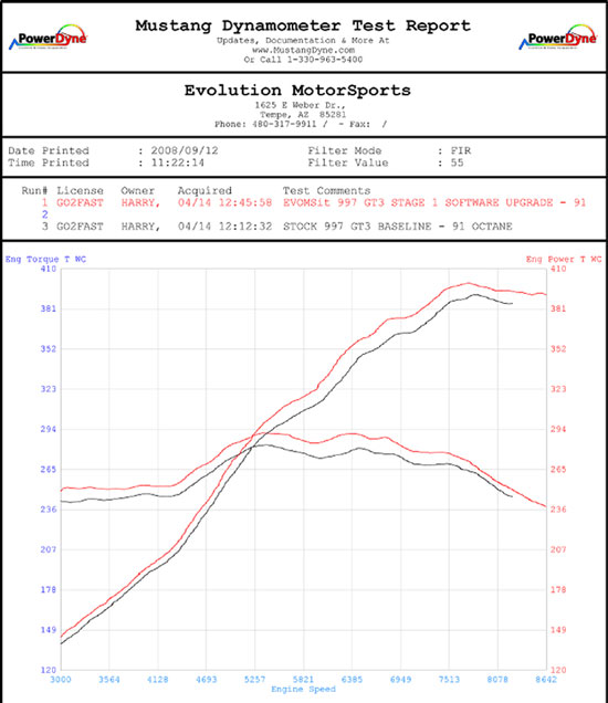 The Evolution MotorSports performance systems for the 997 GT3 and GT3 RS utilizes the Intelligent Tuning of EVOMSit. A tremendous amount of time was spent fine tuning the software for 91 and 93 octane fuels. All performance figures are based on 91 octane and power gains for 93 octane settings are slightly higher. A considerable amount of time was dedicated to the E-gas settings which have been optimized in both sport and non-sport modes. We improved throttle response in both modes which provides an incredibly crisp throttle response while maintaining perfect drivability.